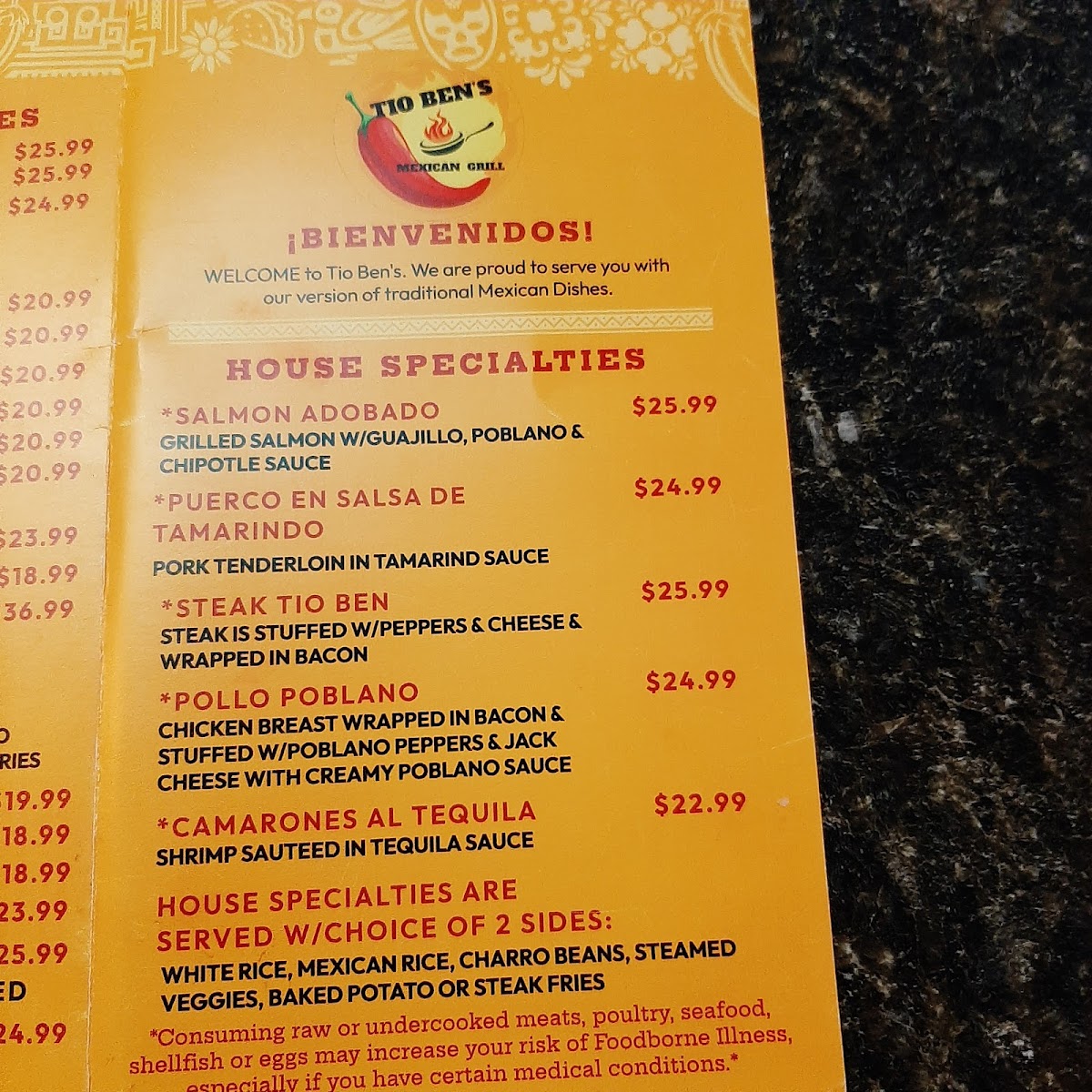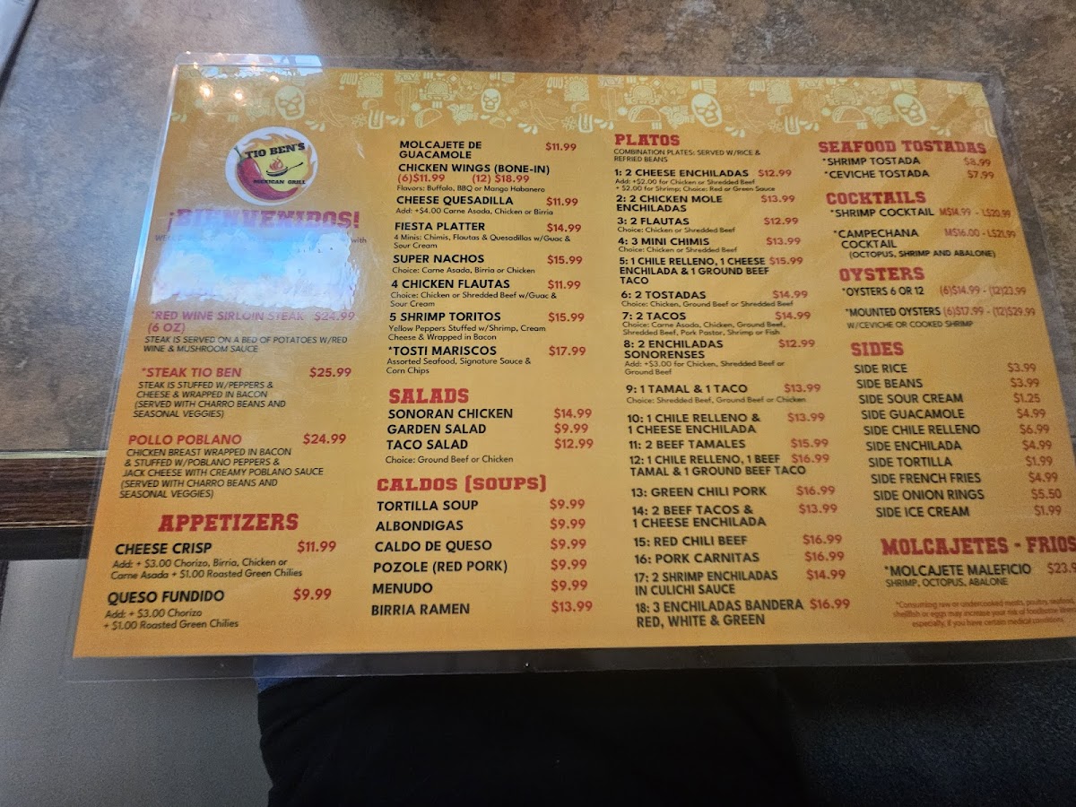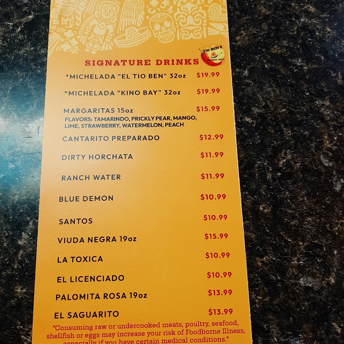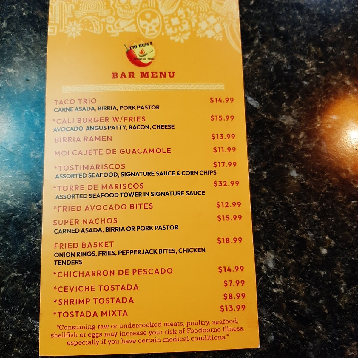 The menu at Tio Ben's at 3682 W Orange Grove Rd is a vibrant celebration of classic Mexican flavors with a few inventive twists, offering something for every palate. Starters like Cheese Crisp, Queso Fundido, and Molcajete De Guacamole set a flavorful tone, while Chicken Wings and Breaded Calamares add a satisfying touch for those seeking heartier bites. Taco lovers are spoiled for choice with options such as Quesabirria, Birria, and Ground Beef, all bursting with rich, savory fillings. The Burros & Chimichangas section features Birria, Ground Beef, and Chicken, complemented by hearty Tortas like Milanesa, Birria, and Chicken, making it easy to find a satisfying main dish. The bar menu is equally enticing, with inventive offerings such as Taco Trio, Birria Ramen, Molcajete De Guacamole, Super Nachos, and a Fried Basket that showcase both comfort and creativity. Beverage options range from draft beers including Budlight, Budweiser, Michelob Ultra, Miller Light, and Coors Light, to a curated selection of wines like Freixenet, Prosecco, Pinot Grigio, Chardonnay, and Cabernet Sauvignon, ensuring every meal can be paired perfectly. Overall, Tio Ben's menu is a thoughtful blend of traditional Mexican staples and inventive dishes, all presented with approachable prices and a lively, welcoming flair that makes it a must-visit for locals and visitors alike.
